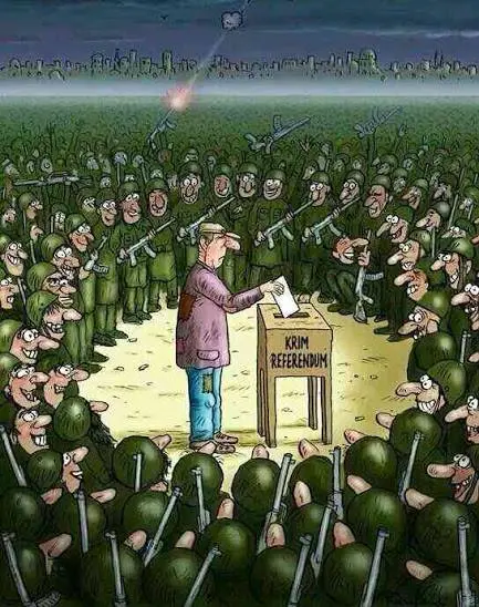 В лютому 2014 року РФ ввела свої війська без розпізнавальних знаків на територію Криму. Були організовані масові фіктивні протести проросійських мешканців півострова. Пізніше загадкові “зелені чоловічки” захопили всі адміністративні споруди, провели фейковий референдум.